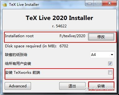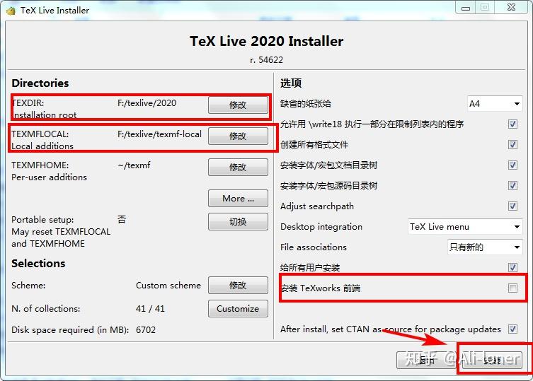 ⑦ 基本更改: 出现下图后,需要进行路径的更改;由于 TeX Live 自带的 TeXworks 不怎么好用,并且此文主要将 vscode 作为 LaTeX 的编辑器,故而取消 安装 TeXworks 前端 的选项,再点击安装