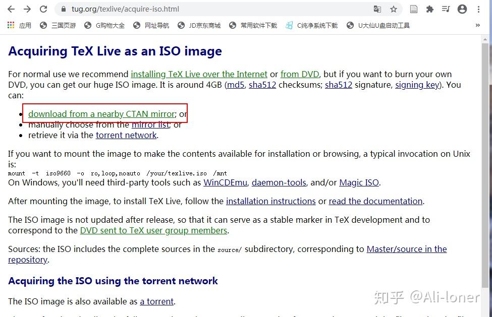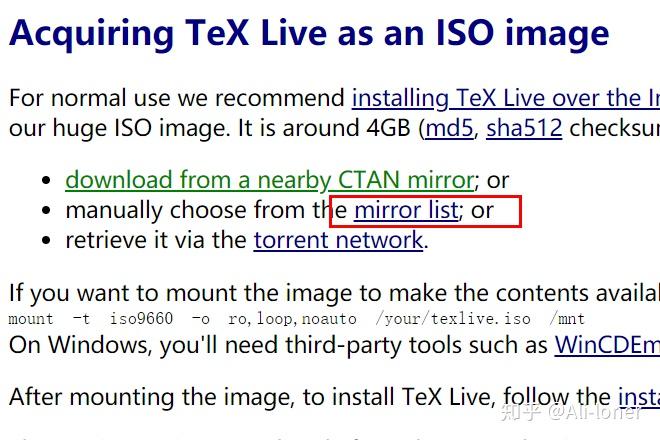 ② 可以看到,笔者已访问清华大学镜像站点,并点击红框标识的链接,进行 TeX Live 的下载安装。