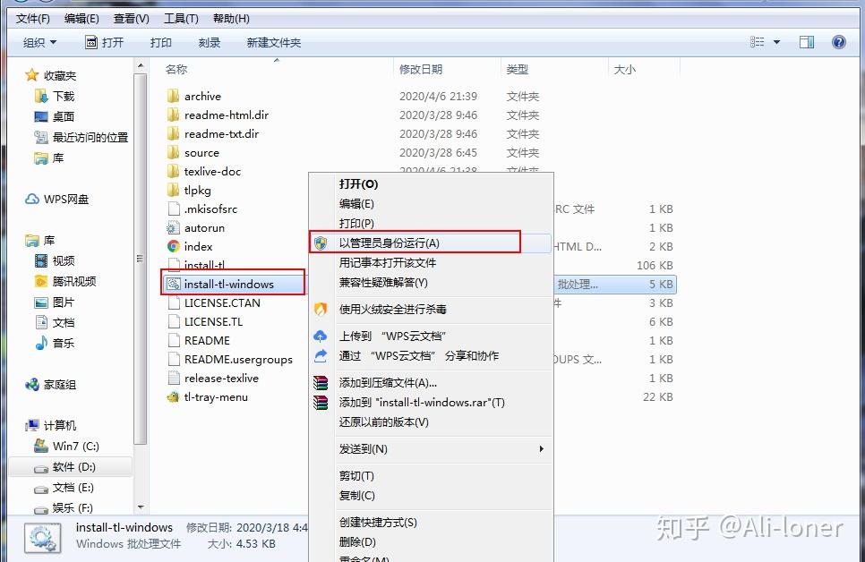 ⑤ 找到 “install-tl-windows” 文件,为了后面不必要的麻烦,右键 以管理员身份运行